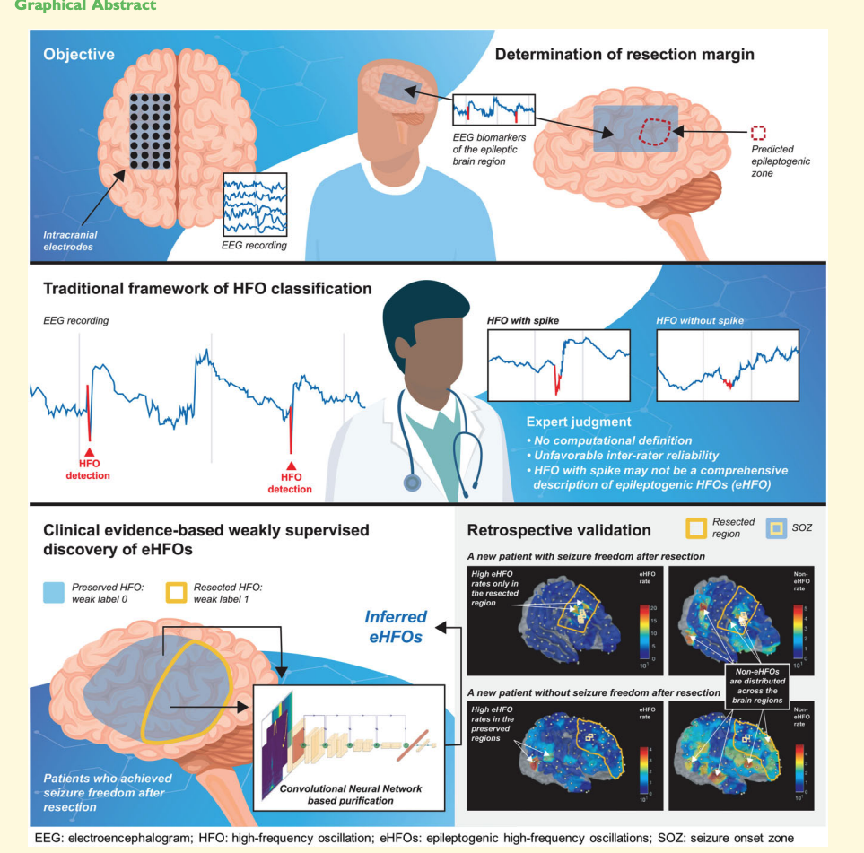 Intracranially recorded interictal high-frequency oscillations have been proposed as a promising spatial biomarker of the epileptogenic zone. However, its visual verification is time-consuming and exhibits poor inter-rater reliability. Furthermore, no method is currently available to distinguish high-frequency oscillations generated from the epileptogenic zone (epileptogenic high-frequency oscillations) from those generated from other areas (non-epileptogenic high-frequency oscillations). To address these issues, we constructed a deep learning-based algorithm using chronic intracranial EEG data via subdural grids from 19 children with medication-resistant neocortical epilepsy to: (i) replicate human expert annotation of artefacts and high-frequency oscillations with or without spikes, and (ii) discover epileptogenic high-frequency oscillations by designing a novel weakly supervised model. The ‘purification power’ of deep learning is then used to automatically relabel the high-frequency oscillations to distill epileptogenic high-frequency oscillations. Using 12 958 annotated high-frequency oscillation events from 19 patients, the model achieved 96.3% accuracy on artefact detection (F1 score = 96.8%) and 86.5% accuracy on classifying high-frequency oscillations with or without spikes (F1 score = 80.8%) using patient-wise cross-validation. Based on the algorithm trained from 84 602 high-frequency oscillation events from nine patients who achieved seizure-freedom after resection, the majority of such discovered epileptogenic high-frequency oscillations were found to be ones with spikes (78.6%, P < 0.001). While the resection ratio of detected high-frequency oscillations (number of resected events/number of detected events) did not correlate significantly with post-operative seizure freedom (the area under the curve = 0.76, P = 0.06), the resection ratio of epileptogenic high-frequency oscillations positively correlated with post-operative seizure freedom (the area under the curve = 0.87, P = 0.01). We discovered that epileptogenic high-frequency oscillations had a higher signal intensity associated with ripple (80–250 Hz) and fast ripple (250–500 Hz) bands at the high-frequency oscillation onset and with a lower frequency band throughout the event time window (the inverted T-shaped), compared to non-epileptogenic high-frequency oscillations. We then designed perturbations on the input of the trained model for non-epileptogenic high-frequency oscillations to determine the model’s decision-making logic. The model confidence significantly increased towards epileptogenic high-frequency oscillations by the artificial introduction of the inverted T-shaped signal template (mean probability increase: 0.285, P < 0.001), and by the artificial insertion of spike-like signals into the time domain (mean probability increase: 0.452, P < 0.001). With this deep learning-based framework, we reliably replicated high-frequency oscillation classification tasks by human experts. Using a reverse engineering technique, we distinguished epileptogenic high-frequency oscillations from others and identified its salient features that aligned with current knowledge.