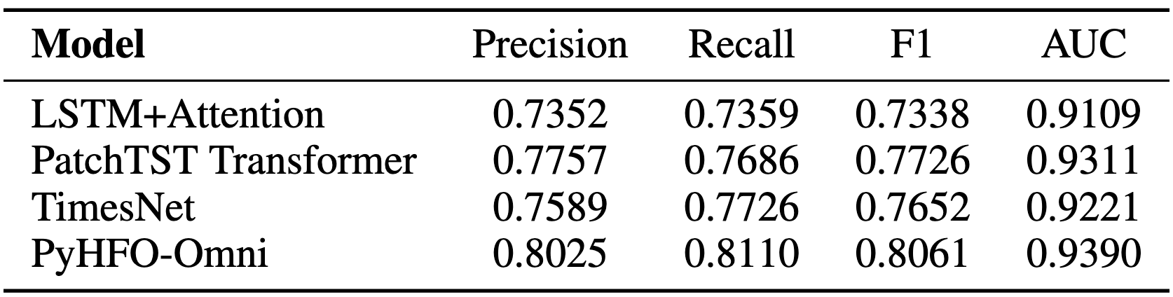 We benchmark recent competitive baseline event classification methods. PyHFO method trained on Omni-iEEG achieves the highest F1 (~0.81), demonstrating strong performance on spkHFO detection.