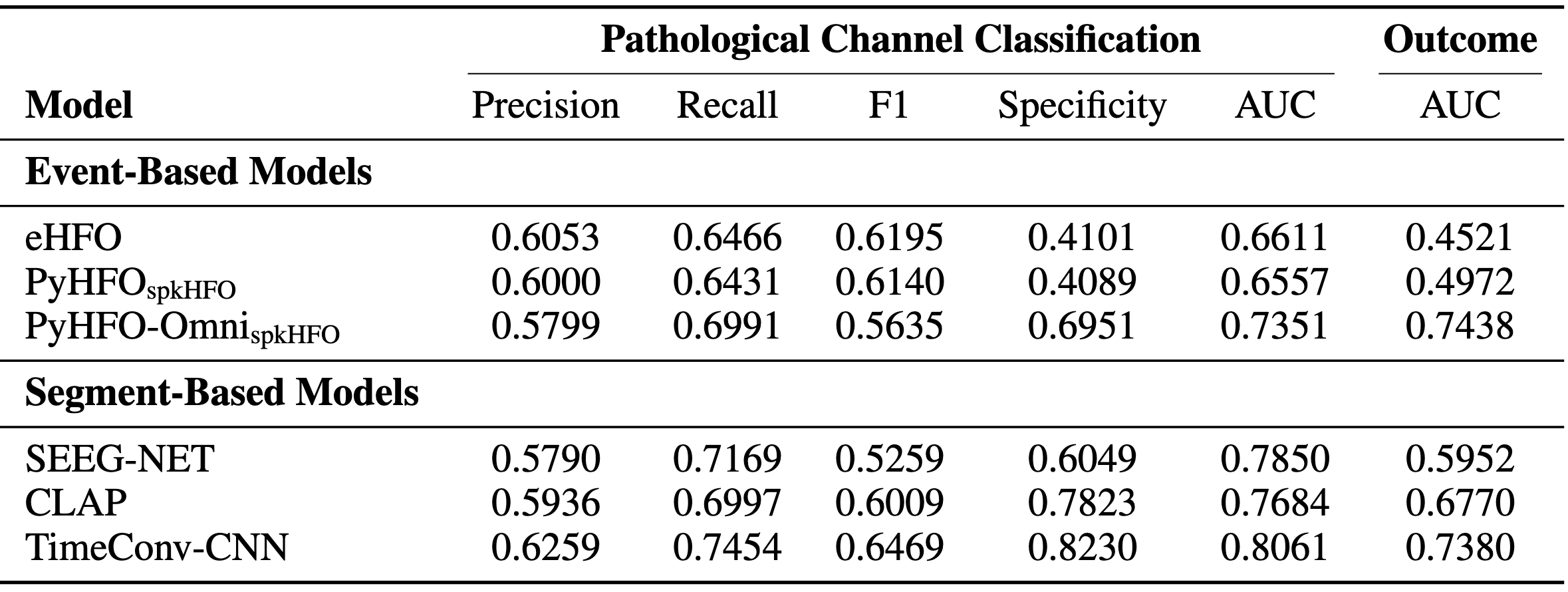 Both event-based and segment-based models are evaluated. Segment models (TimeConv-CNN, CLAP, SEEG-Net) achieve up to 0.81 AUC in pathological channel identification and correlate well with surgical outcome prediction.