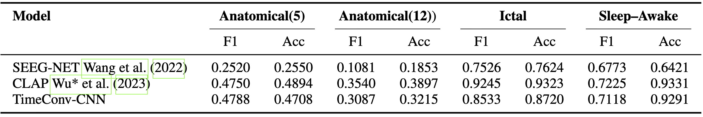 Pretrained audio models (CLAP) perform strongly (e.g., F1 = 0.92, Acc = 0.93 on ictal classification), while CNNs remain competitive.
